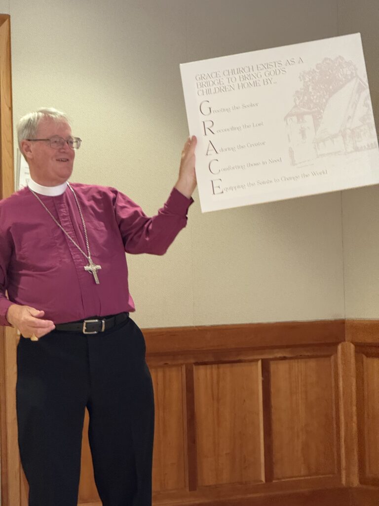 I am so incredibly grateful to Bishop Alan for the nearly 3 years of his life that he has given to us, to Donna for sharing him with us and becoming such a vibrant part of our community, and to God for bringing us together! I know this is not a goodbye, but merely an “hasta luego”… We’ll see you later! I’m so pleased Bishop Alan will be with us in October for the Church Future conference and in November for the 150th anniversary. It would be impossible to fully put into words all that Bishop Alan’s time with us has given us, but what I am most grateful for is that he has given me and Grace Church back to each other. I am so excited to be returning full-time to this beloved congregation.  Because of Bishop Alan‘s guidance, God‘s grace, and the congregation’s faith and resilience, we are on firm footing as we look to a future with celebration, anticipation, and creativity. We’re going to have a lot of fun!
